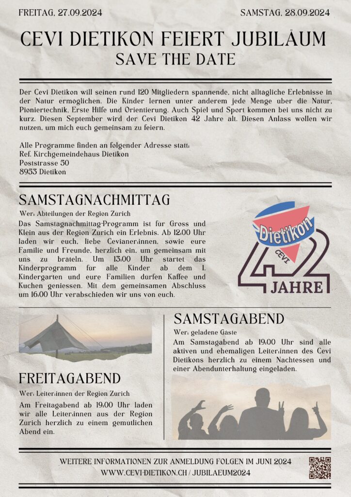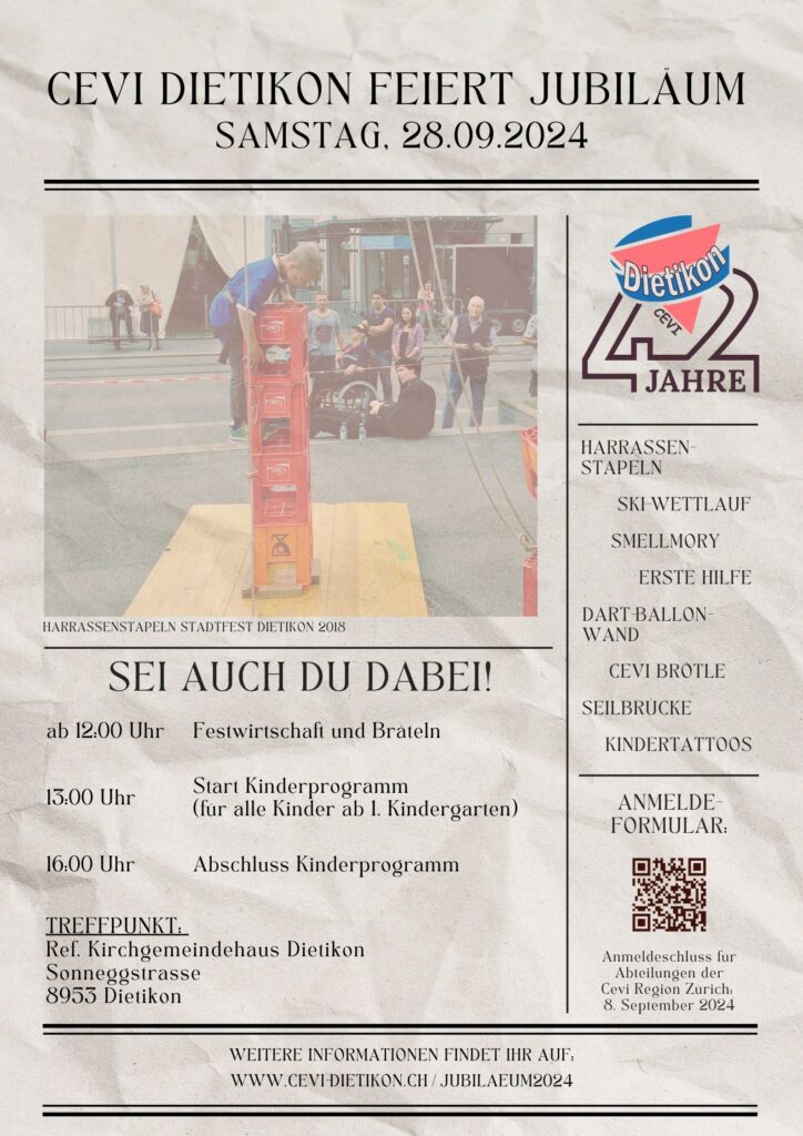 Der Cevi Dietikon will seinen rund 120 Mitgliedern spannende, nicht alltägliche Erlebnisse in der Natur ermöglichen. Die Kinder lernen unter anderem jede Menge über die Natur, Pioniertechnik, Erste Hilfe und Orientierung. Auch Spiel und Sport kommen bei uns nicht zu kurz. Diesen September wird der Cevi Dietikon 42 Jahre alt. Diesen Anlass wollen wir nutzen, um mich euch gemeinsam zu feiern.